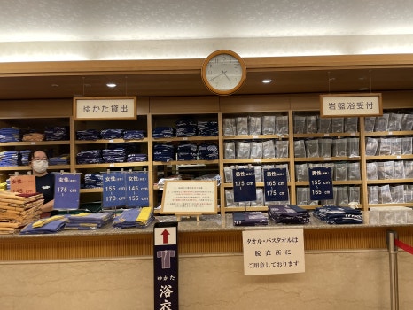 아까 입구에서 교환한 티켓을 보여줍니다. 그리고 나머지 금액을 계산하면 끝! 이렇게 표를 구매하셨다면! 키를 하나 줄겁니다. 그 키를 들고 오른쪽으로 가시면 계단이 있어요. 거기를 내려갑니다. 내려가면 유카타를 대여할 수 있는곳이 있어요. 만약 암반욕을 신청했다면 그 유카타 카운터 오른쪽 편에서 암반욕 전용 옷을 받으시면 됩니다!